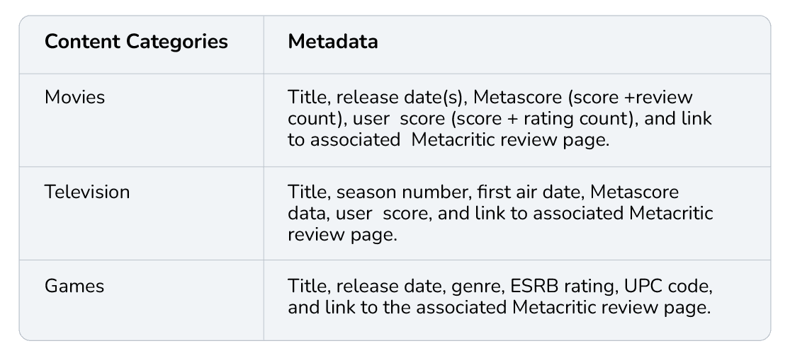 1. Metacritic Content. Metacritic Content is comprised of the following: