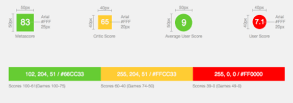 ● “Metacritic metascoreTM” – The metascoreTM is the weighted average of review scores assigned by individual critics to a particular item within a Content Category. It is an integral component in the expression of the metacriticTM brand. The metascoreTM is displayed as a number in a square or rectangle on a solid colored background. A “good” metascoreTM is coded in green, an “average” metascoreTM is yellow, and a “bad” metascoreTM is red. Products with metascoreTM that have yet to be calculated should display “tbd” on a gray background. Please refer to www.metacritic.com/about-metascores for the score conversion scales that specify when each color is used.